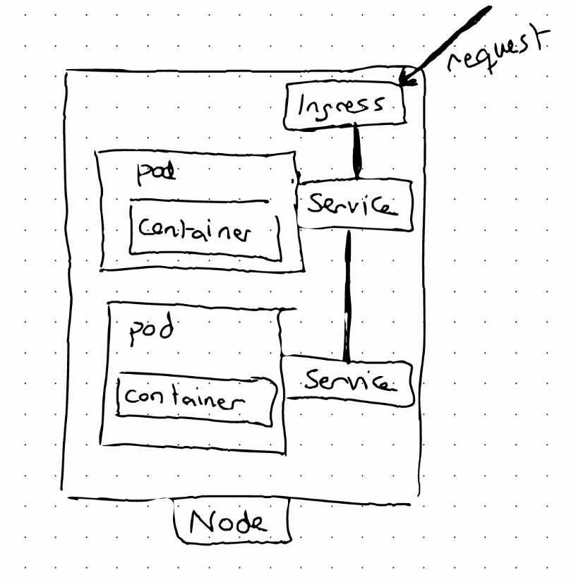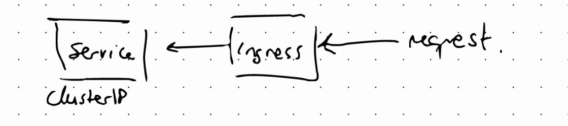 A request goes first to Ingress and it does the forwarding to the Service.