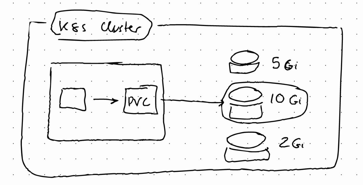 - Pod claims storage via PVC